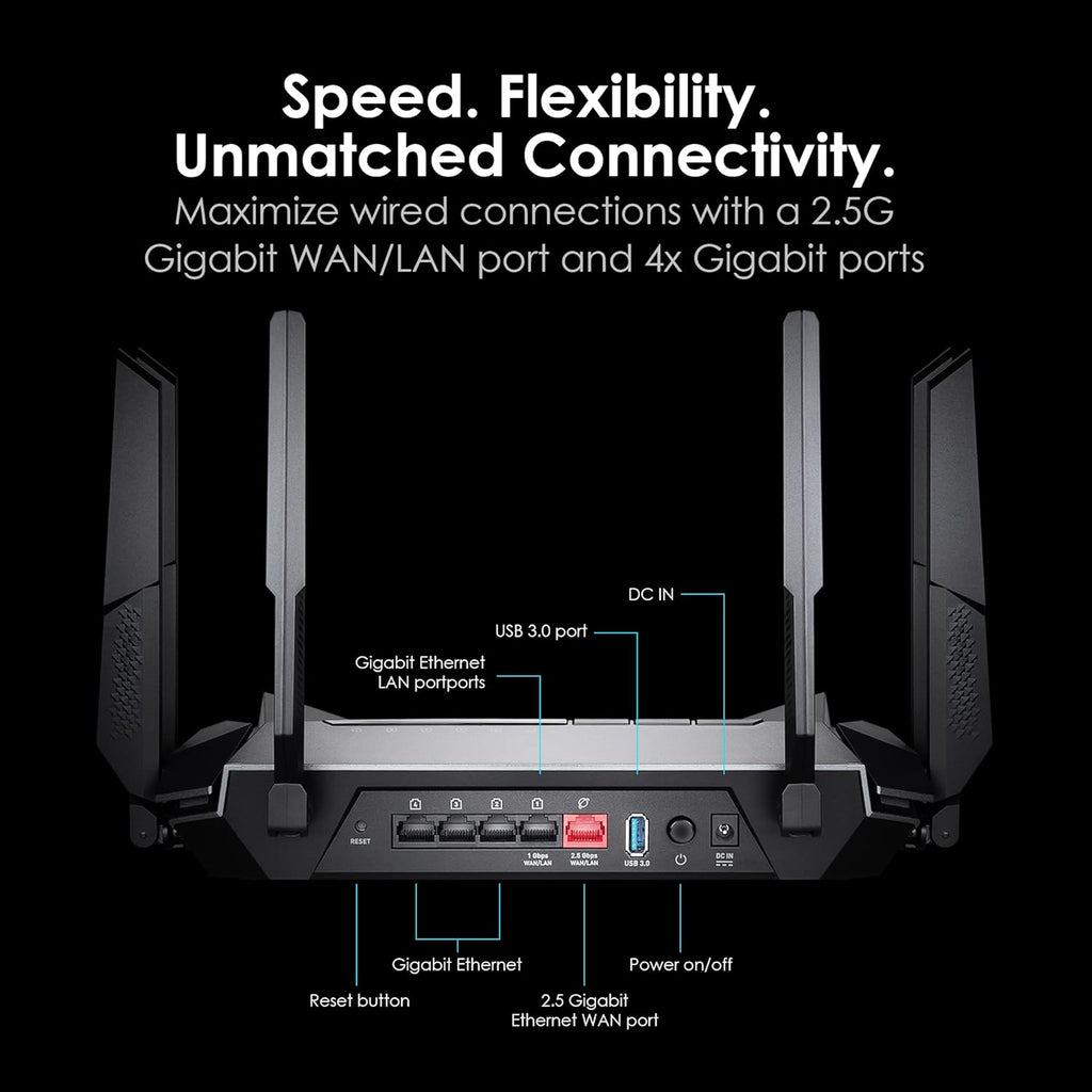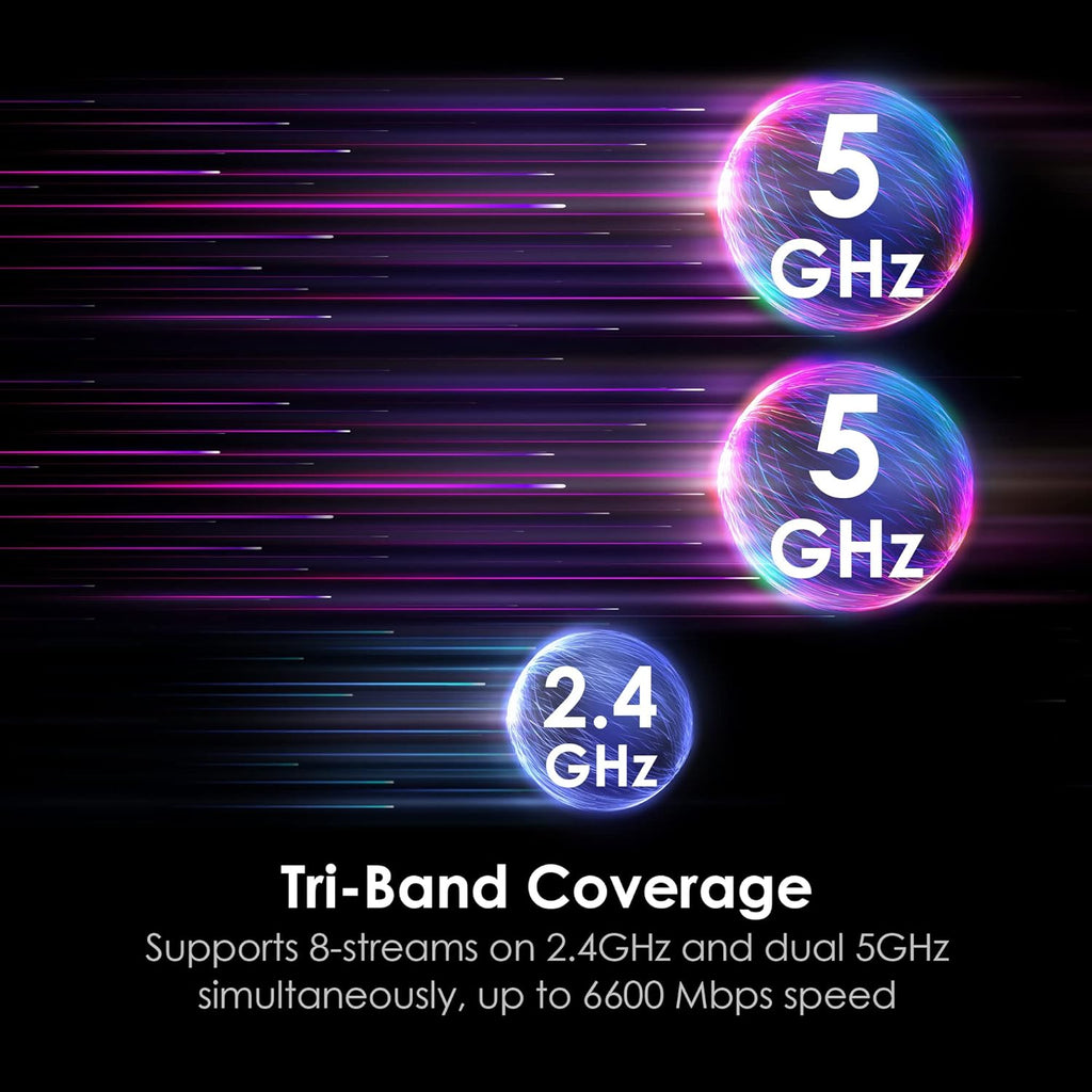 The RadiX AX6600 delivers lightning-fast transfer speeds of up to 6600 Mbps with OFDMA, MU-MIMO and 1024-QAM technologies. Its dual 5 GHz and one 2.4 GHz bands benefit all your devices with superb connectivity, connecting up to 60 concurrent devices.