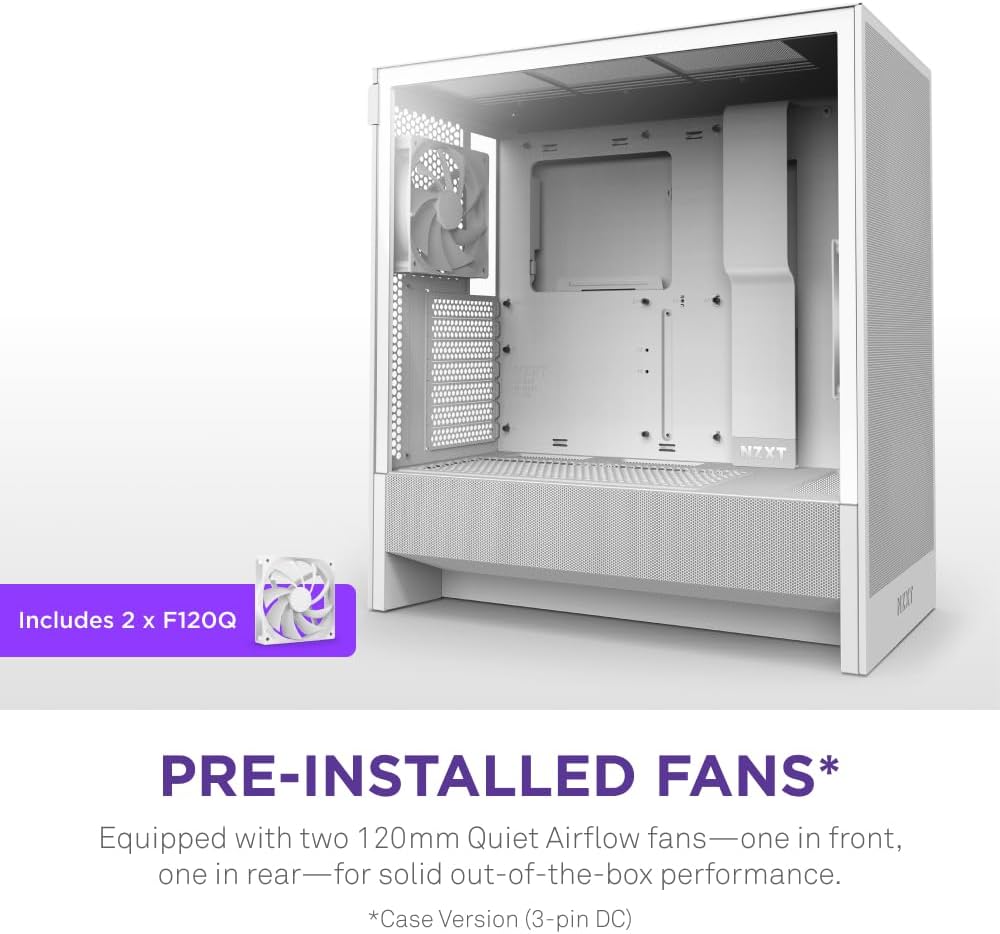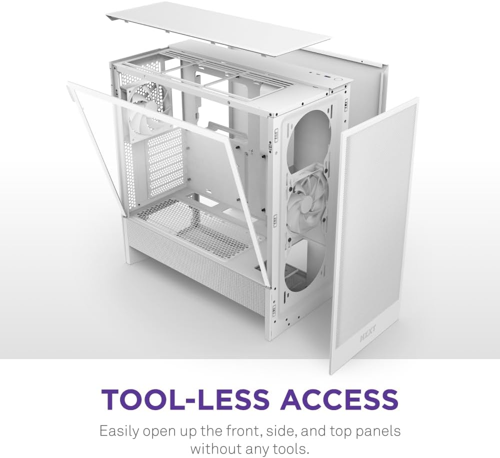 The H5 Flow boosts airflow and GPU cooling with its perforated PSU shroud, mesh panels, and large radiator support—all in a compact mid-tower form factor.