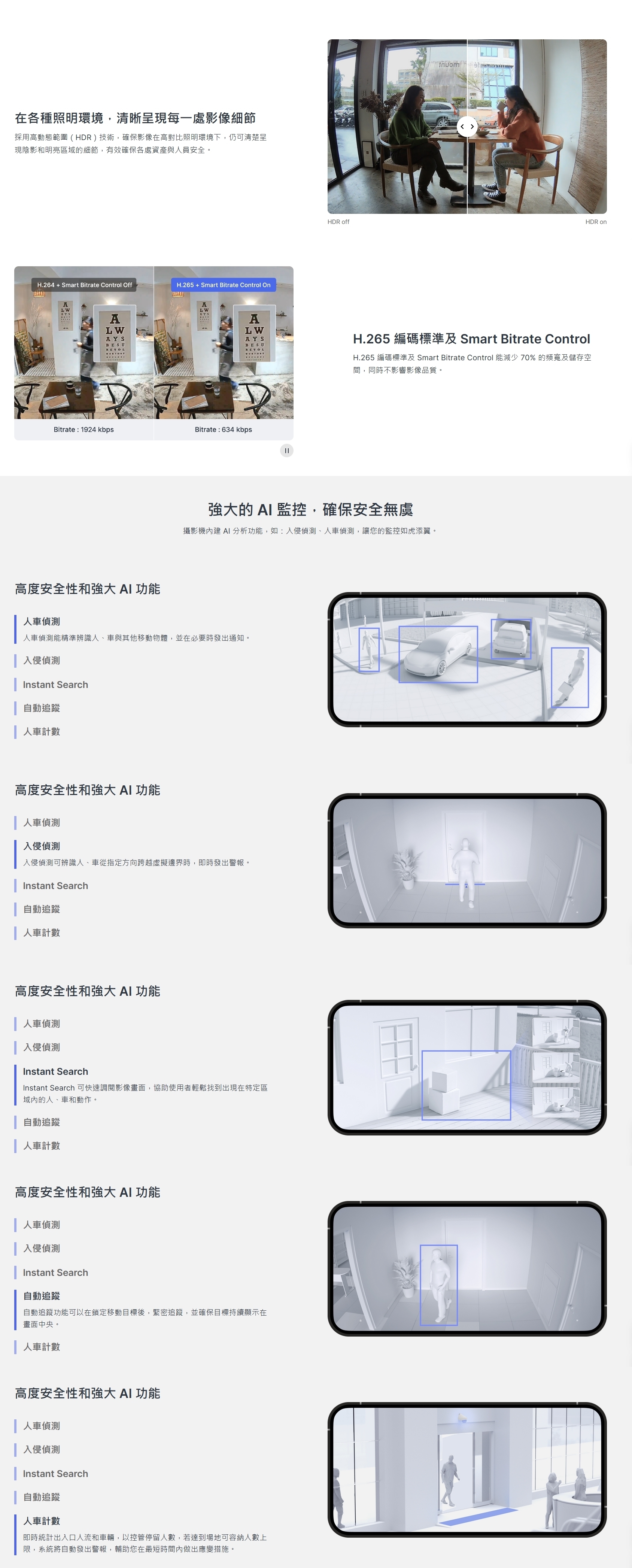 • 邊緣 AI 運算偵測與搜尋,支援攝影機上的人車偵測、入侵偵測、計數、Instant
