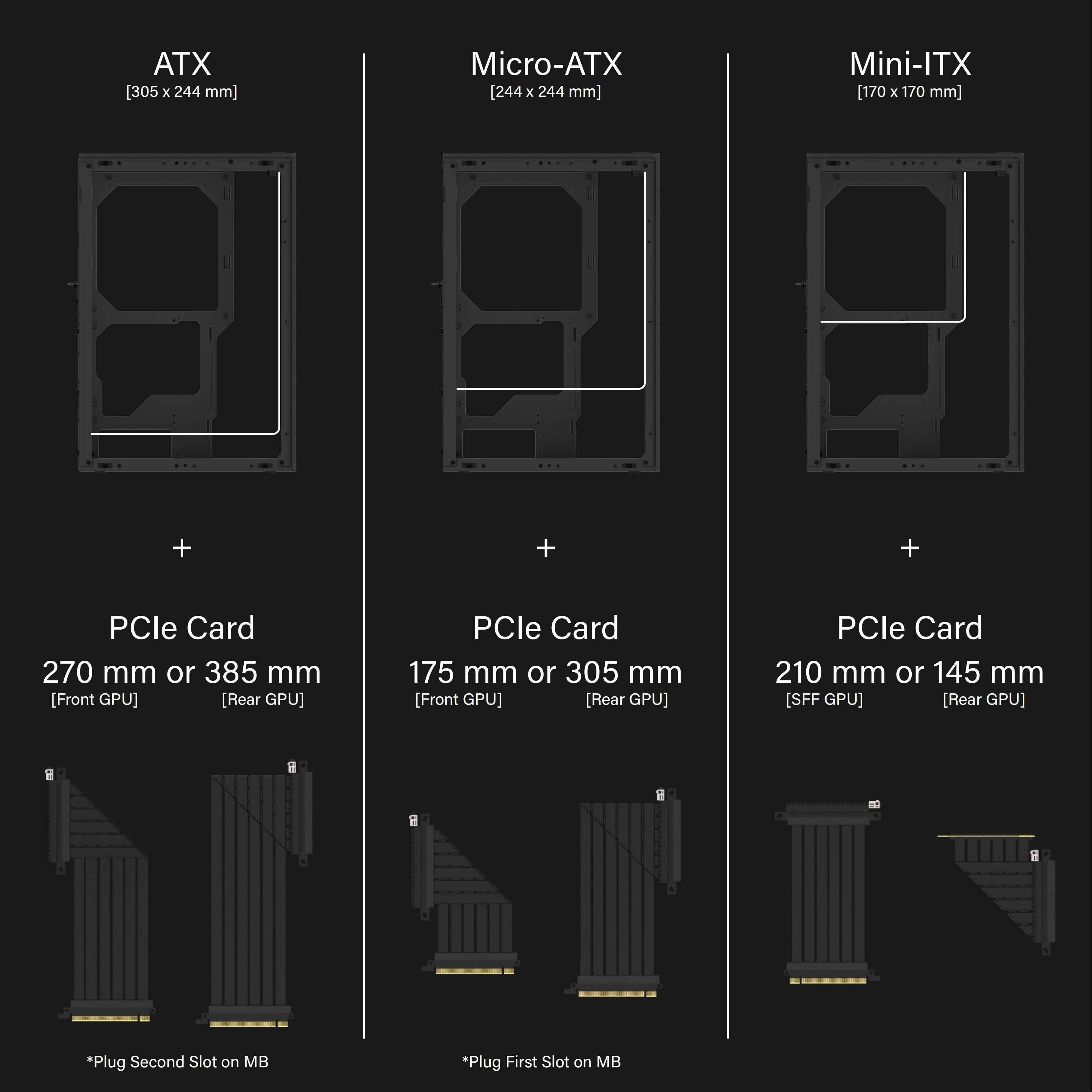 - Meshroom S with PCIe 4.0 Includes Dual Reverse 145mm version or Female Reverse 200mm version (randomly shipped). The Female Reverse 200mm version is an upgraded option, offering enhanced compatibility for more build configurations and improved stability.