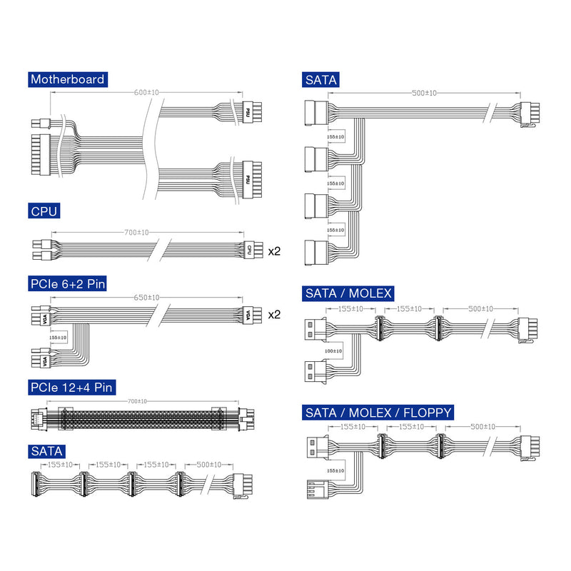| ATX 24 | 4+4 PIN | 12VHPWR | PCIe 6+2 | SATA | Molex (PERIPHERAL) |