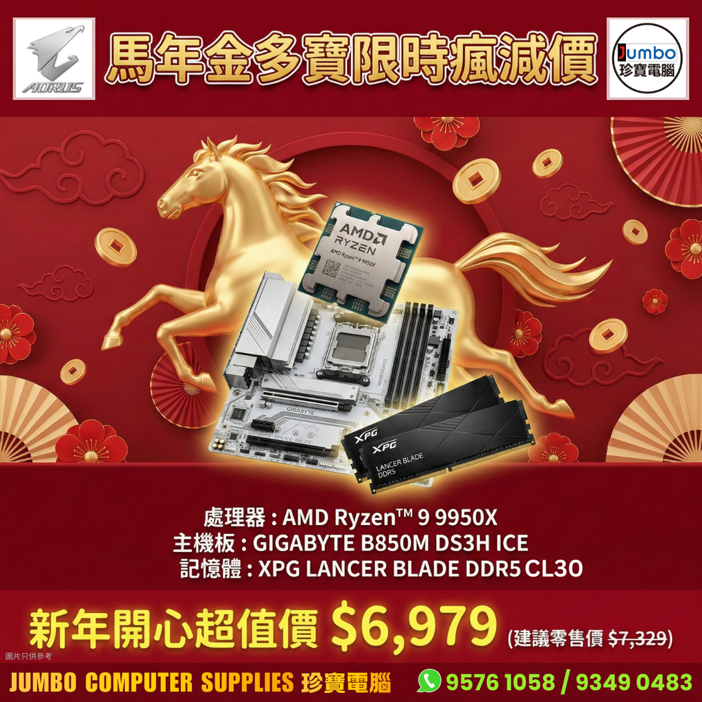 GIGABYTE B850M DS3H ICE + AMD Ryzen 9 9950X Tray + ADATA 32GB Kit (2x16GB) XPG LANCER BLADE DDR5 6000MHz CL30 金多寶套餐