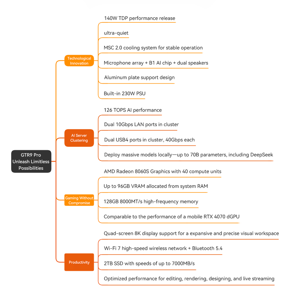 Equipped with dual 10GbE LAN ports and dual USB 4 (40Gbps), the GTR9 Pro can serve as an AI computing hub, supporting local deployment of massive models like DeepSeek 70B for secure, private AI applications.