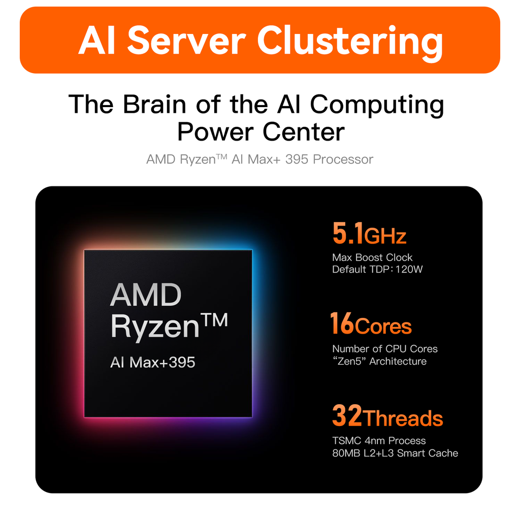 | CPU | AMD Ryzen™ AI Max+ 395, 16 cores / 32 threads, turbo up to 5.1GHz, 64MB L3 Cache, AI : Up to 126 TOPS |