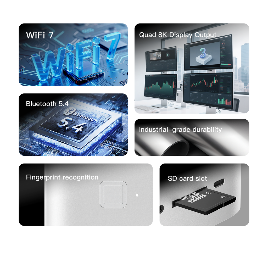 Featuring HDMI (2.1), DisplayPort (2.1), and dual USB 4 ports (40Gbps/8K@60Hz), the GTR9 Pro supports up to four 8K displays, perfect for expansive workspaces and high-precision tasks.