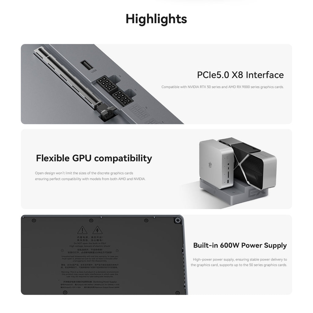 - šćPCIe x8 Interface for Lossless Connection to External Desktop Graphics Cardsć--- Featuring a PCIe x8 interface (delivering PCIe 5.0 speeds on GTi14 & 15, and PCIe 4.0 on GTi12 & 13) for a lossless connection to external desktop graphics cards. When using the mini PC with a discrete graphics card, please power on the EX docking station first, then turn on the mini PC using their respective power buttons. The dual-switch design allows you to operate the mini PC and EX docking station independently or together, saving energy and extending the products' lifespan.