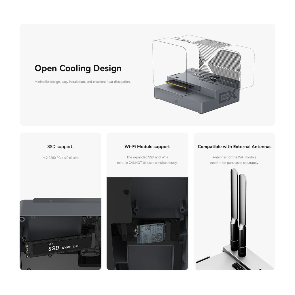 - šćAbundant Expandable Choicesć--- EX Pro Docking Station also supports M.2 2280 PCIe 4.0 x1 SSD, Wi-Fi Module and External Antennas.