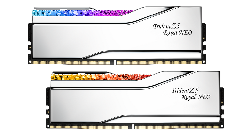 Trident Z5 Royal Neo is the luxury-class of extreme overclock performance DDR5 memory designed for AMD AM5 platforms, featuring a crown jewel design with a crystalline light bar for a magnificent display of customizable RGB lighting and electroplated aluminum heatspreaders with a mirrored finish in gold or silver colors.
