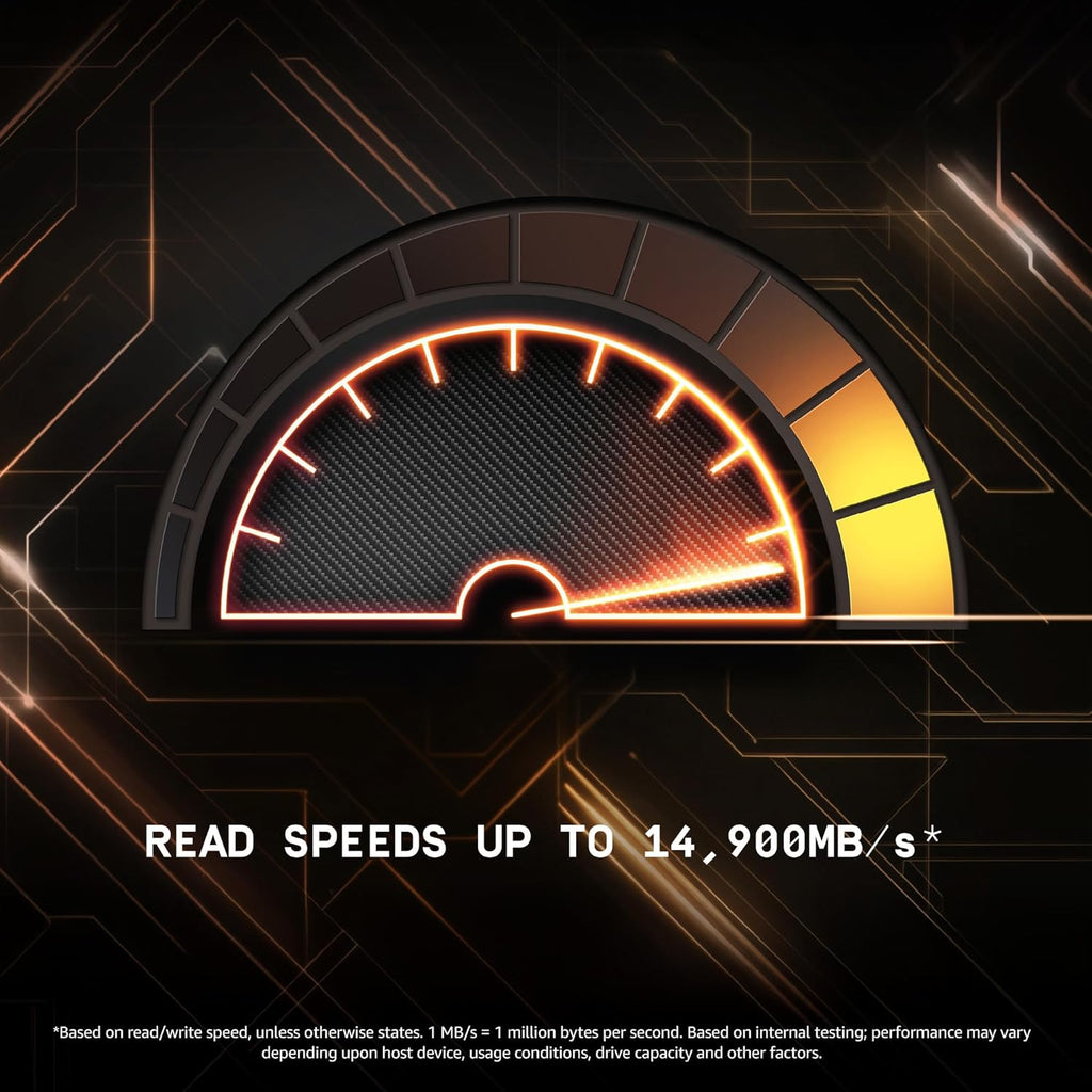 • 您的 SSD 硬碟的順序讀取速度高達驚人的 14,900MB/s,順序寫入速度高達 14,000MB/s,隨機讀寫效能超過 2,300,000 IOPS(2TB – 4TB 型號)。